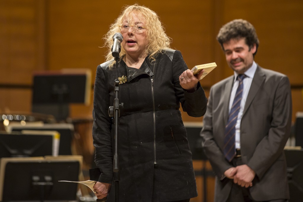 24 mars 2013 MAR_1359 Malgorzata Polanska, fondatrice du label Dux vante les vertus de Stanislaw Moniuzko dont elle enregistre l’intégrale de l’oeuvre. Derrière elle, le baryton Leszek Skrla © Björn Woll MAR_1321 MAR_1381