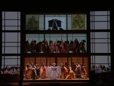 Quant à la mise en scène d’Alvis Hermanis, elle est largement tributaire du théâtre kabuki où chaque mouvement, chaque intention sont motivés psychologiquement. Sous de somptueux costumes imaginés par Kristine Jurjane et de judicieux éclairages conçus par Gleb Filshtinsky, tout soliste, choriste ou danseur devient une œuvre d’art en mouvement. Douze ballerines-geishas font cortège à la protagoniste, à la fois chanteuse et danseuse. Le décor dû au régisseur n’est qu’une succession de paravents en papier de riz sur trois niveaux où sont projetées de délicates aquarelles. Le début du deuxième acte fait sourire : Cio-Cio-San en crinoline victorienne noire s’escrime contre une machine à coudre face à une image de la Madone, alors que Suzuki se glisse furtivement dans le coin d’un canapé où Sharpless sirote un whisky. Tout bascule au dénouement quand la scène de harakiri devient une véritable liturgie en présence des compagnes de l’infortunée qui arborent le blanc du deuil.