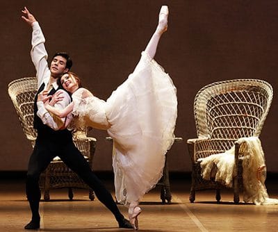 En une optique cinématographique, le jeune homme évoque sa liaison avec Marguerite Gautier, la courtisane vilipendée, que personnifie magistralement Zvetlana Zakharova. L’action est accélérée par quatre ‘pas de deux’, dont trois nous mettent en présence d’un Armand impulsif jusqu’à l’effronterie, dont Roberto Bolle s’ingénie à dégager l’incontestable sincérité ; car, à coup d’arabesques désespérées et de ronds de jambe rageurs, il se débat face à l’inéluctabilité du destin. En lever de rideau, sa partenaire semble se jouer de ses élans d’affection avant de céder à l’empire de la passion. Dans la maison de campagne, une jeunesse dorée arbore de blanches tenues que pimente le rouge jockey d’un Gaston Rieux plaisantin (Gioacchino Starace) ; mais brutalement, un coup de poing est asséné sur le piano de scène. Surgit l’homme en noir, Monsieur Duval : tandis que, dans la fosse d’orchestre, Roberto Cominati enchaîne quatre des plus sombres Préludes de l’opus 28, Mick Zeni qui livre une composition saisissante, sait passer de l’austère componction à une compassion douloureuse, alors que la malheureuse traduit son désarroi par de convulsifs fouettés. La Première Ballade en sol mineur atteint le paroxysme du tragique, alors que les amants à nouveau réunis se laissent consumer par la passion destructrice qui les ronge inexorablement. Continuellement, l’infortunée a devant les yeux le drame de Manon et du Chevalier des Grieux qui a été représenté au Théâtre des Variétés ; en ces deux créatures personnifiées par les remarquables Nicoletta Manni et Marco Agostino, elle nie énergiquement la perspective en miroir de sa propre destinée. Ses rivales, l’Olympia de Caterina Bianchi, la Prudence d’Antonella Albano, semblent évoluer dans un univers qui lui est aussi étranger que celui où paraissent ses prétendants, le Duc de Riccardo Massimi ou le Comte de N. d’Antonino Sutera. Et les scènes de bal dans les tons rouge vif, or et noir magnifient le Corps de ballet, réglé à la perfection par Frédéric Olivieri.
