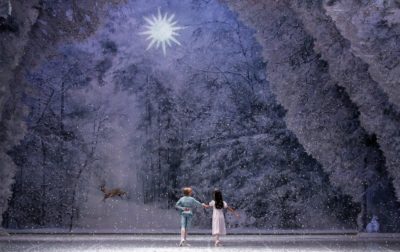 Sous de suggestifs jeux de lumières imaginés par Marco Filibeck, Margherita Palli  élabore un cadre scénique verdâtre qui, au travers d’un écran représentant une façade, fait apparaître un intérieur bavarois plutôt cossu où, un soir de Noël, une famille de bons bourgeois reçoit une douzaine d’invités avec leurs enfants ; car ce sont bien eux qui règnent en maîtres dans cet univers empesé où, rapidement, se glisse une sensation de mystère avec l’intervention du conseiller Drosselmeyer (remarquable composition d’Alessandro Grillo) qui fait apporter d’abord trois énormes cadeaux contenant un Arlequin, une Colombine et un soldat de plomb, s’animant ingénieusement par les bons soins de Gaia Andreanò, Christelle Cennerelli et le magnifique Mattia Semperboni ; puis à sa nièce Marie (la si touchante Chiara Ferraioli), il offre en surplus un casse-noisette que voudront mettre en pièces le petit frère Fritz (Amos Halilovic) et ses garnements de camarades. Sous la baguette de Mikhail Jurowski qui allie le sens du coloris à la précision du trait, l’Orchestre milanais ajoute, durant le changement de tableau, un intermezzo destiné à La Belle au Bois Dormant (recalé de la version newyorkaise) comprenant une partie de violon solo écrite pour le virtuose Leopold Auer. Dès ce moment-là, s’impose le concept originel de Balanchine avec l’arbre de Noël qui grandit démesurément, le casse-noisette/prince luttant avec son régiment de militaires/marionnettes en bois contre les grotesques souris et leur roi de si haute stature (Edoardo Caporaletti). D’une fascinante poésie se révèle le tableau hivernal au cœur d’une forêt de mélèzes ployant sous la neige, où, par groupes de huit, les ballerines en longs tutus blancs ébauchent de rapides figures d’une valse que chantent les Voix blanches du théâtre, préparées par Marco De Gaspari.