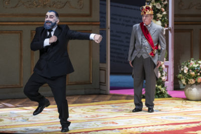 Sur scène, cinq des chanteurs sur neuf faisaient partie de la production lyonnaise de 2019. Tel est le cas d’Héloïse Mas, impayable Boulotte osant appuyer les graves de son mezzo pour faire valoir son argot gouailleur et la pétulance provocante de son physique avantageux qu’aurait assurément prises à son compte Hortense Schneider. Elle tient tête ainsi à Florian Laconi qui reprend à Yann Beuron le rôle de Barbe-Bleue en lui prêtant un timbre plus éclatant et une finesse de vocalisation notoire, tout en lui conservant la froideur calculée de l’érotomane insouciant qui veut parvenir à ses fins par n’importe quel stratagème. La jeune Jennifer Courcier retrouve le personnage de Fleurette /Hermia dont elle a l’ingénuité délurée et l’obstination face à un nouveau Saphir dégingandé, Jérémy Duffau, usant de sa mèche de cheveur rebelle pour assurer sa stature de tenorino jeune coq défendant son bon droit. Christophe Montagne, Christophe Gay et Thibault de Damas reprennent leur composition du roi Bobèche, de Popolani et du Comte Oscar, dont ils accentuent la verve par leur diction incisive. Julie Pasturaud s’empare du rôle de la reine Clémentine dont elle a la retenue compassée de l’épouse trompée, tandis que les cinq femmes de Barbe-Bleue sont campées par Naïma Wanshe (Héloïse), Léa Sirera (Eléonore), Lauriane Paillet (Isaure) Eudoxie Mottironi (Rosalinde) et Solène Nancy (Blanche).