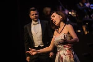 Une lumineuse inventivité s’invite à la scénographie, qui installe l’orchestre sur un espace surélevé, au même niveau que le premier balcon de la salle, dégageant ainsi la moitié avant de la scène. Cela permet aux personnages et aux choristes d’évoluer librement et de se prêter à des jeux scéniques avec des mises en espace très proches d’une mise en scène : les entrées et les sorties de personnages, des gestes évoquant des accessoires… Au milieu d’Aleko, les choristes sont placés dans les coulisses pour créer un effet d’éloignement très réussi. Il existe bien une direction des chanteurs mais le programme ne mentionne aucun nom comme « metteur en espace ». Alors, on pense que ce sont les chanteurs eux-mêmes qui règlent ce ballet bien pensé et efficace. En effet, les mouvements et les regards théâtralisés des chanteurs vêtus en noir comme au concert et qui se déplacent dans un espace noir nous offrent curieusement des idées des costumes et des décors colorés !