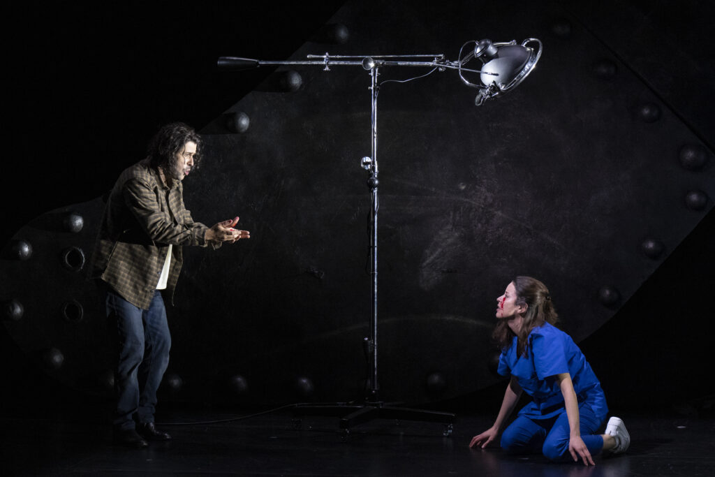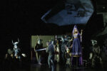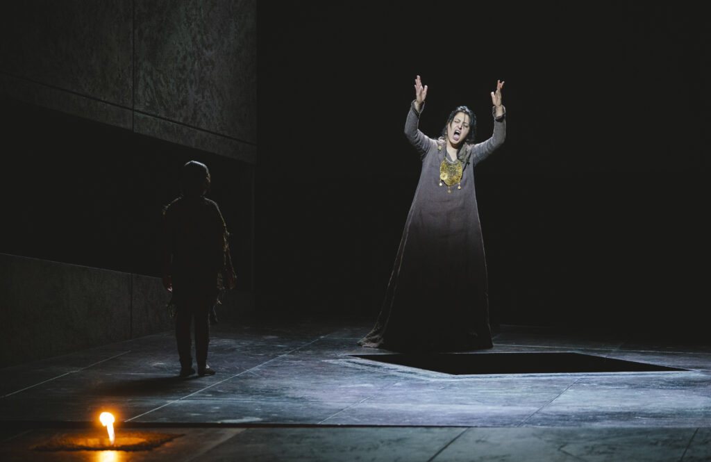 Dès l’ouverture, le spectateur est plongé dans un univers scénique radical. Le metteur en scène Francisco Negrín impose un décor minimaliste, froid, dominé par des teintes grises et la présence obsédante d’un brasier central. Le feu devient un motif omniprésent, presque suffocant. Pourtant, malgré une cohérence conceptuelle — Negrín envisage l’œuvre comme un opéra de fantômes, hanté par les traumatismes du passé — le résultat laisse perplexe. Le contraste entre la vitalité de la musique et la noirceur appuyée de la scène crée une véritable dichotomie. Certaines options, comme ce chœur rampant à la manière de silhouettes larvaires, finissent par agacer plus qu’elles ne servent le propos.