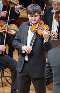 S’il ne remporte pas le concours, Oleksii Semeneko repartira au moins avec un fan club. A peine rentre-t-il sur scène qu’une partie du public l’acclame, une pression supplémentaire. Le candidat ukrainien âgé de 26 ans étudie actuellement à la Hochschule für Musik de Cologne. Habitué des concours, il obtient un troisième prix au Concours International Paganini de Moscou, un premier prix au Concours International Boris Goldstein et remporte les Young Concerts Artists International Auditions à New-York. Il débute …aussi peu que les nuages… avec résolution, dans un tempo relativement rapide. Arborant un jeu limpide, le candidat est l’affût d’effets cachés et surprises sonores dans la partition. De fait, le contact avec Marin Alsop en sera plus naturel, presque intime. Globalement, ce sont les nombreuses dynamiques, les contrastes et petites touches personnelles qui auront fait de cette lecture l’une des plus passionnantes de la semaine. Dans Sibelius, chaque mouvement correspond à ce que l’on attend : fluidité et compréhension du discours, homogénéité du son, aboutissement des phrases et surtout un rapport et une balance adéquats avec l’orchestre. Ce soir, l’auditeur a affaire un artiste mature dont le jeu limpide et naturel, grâce à un archet précis, offre une lecture plus que convaincante. Le second mouvement marque les esprits par un ton résolument personnel et une volonté accrue de développer un dialogue avec l’orchestre. L’orchestre qui d’ailleurs semble plus en adéquation ce soir avec les candidats. Seraient-ils plus inspirés ? Chez Semenenko, tout est sujet à expressivité, clarté et énergie. Le troisième mouvement ne déroge pas à la règle et conclut la prestation du candidat avec panache. Le résultat est tel que l’orchestre et Marin Alsop suivent le candidat avec respect et attention, le laissant libre de ses mouvements. Devant un public partiellement debout, le candidat a, malgré quelques très rares accidents ou soucis de justesse, offert plus qu’une épreuve : un vrai concert.