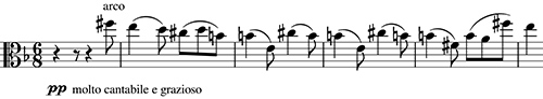 Cette cadence contient également des éléments thématiques proches du 3e Thème qui seront repris ensuite par le piano en dialogue avec les cordes (NB. changement de mesure en 6/4), sur une pédale de dominante en Mi Majeur.