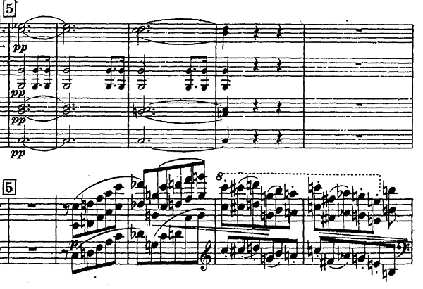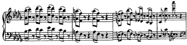 (Mes. 177, env. 5'46'') un sourd martèlement aux deux mains alternées sert de pont vers le 2e Thème.