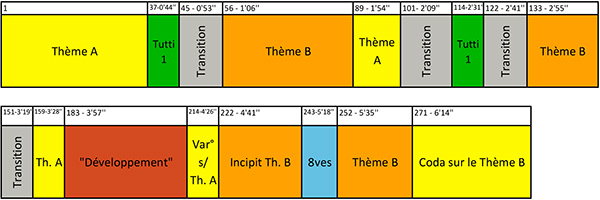 Ensuite, vous posez un enregistrement du concerto sur votre lecteur (ou vous cliquez sur l’intitulé du mouvement qui vous conduira sur YouTube) vous suivez l’écoute en re-lisant l’article. Pour que vous puissiez vous appuyer sur les repères courants, nous vous donnons les indications de minutage (écoute) et les n° des mesures (partitions), ainsi qu’une ligne du temps.