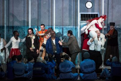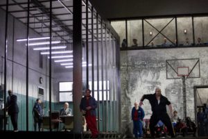 Bien évidemment l’univers carcéral, sa violence intrinsèque, son misérabilisme affectif et sa déshumanisation sont un terreau de choix pour les relectures au scalpel du scénographe. Les comportements sont scannés, les humeurs sont sur-analysées dans un geste qui sait tirer le meilleur des chanteurs tout en animant la narration de diverses sous actions. Krzysztof Warlikowski sait toujours diriger aussi magistralement ses chanteurs, c’est sur ce point toujours exemplaire ! Le décor brutaliste de Małgorzata Szczęśniak est naturellement bien assorti à cette vision. Cependant, on peut trouver que Krzysztof Warlikowski reste relativement prisonnier d’une lecture premier degré, à l’image de cette vidéo d’introduction où Michel Foucault parle de la prison ou de certains tics de mise en scène surlignés au gros marqueur comme ces gardiens, sanglés dans leurs tenues anti-émeutes façon Robocop qui dealent la drogue entre eux et avec les détenus ou encore ces autres détenus aux frontières de l’overdose pris de convulsions nerveuses frénétiques ! Krzysztof Warlikowski et son équipe signent une belle réalisation mais qui reste un peu trop premier degré, loin de la force légendaire du spectacle mythique de Patrice Chéreau.