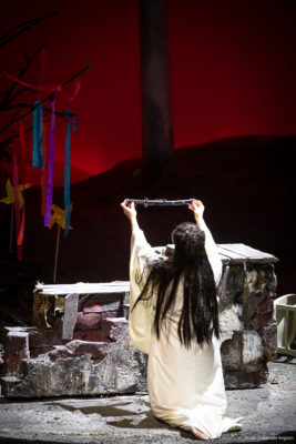 Dans sa mise en scène, Daniel Benoin a voulu l’installer dans un contexte qui nous est sans doute plus parlant, celui du Japon anéanti en 1945 par les bombes atomiques d’Hiroshima et de Nagasaki justement. Malheur aux victimes… C’est une idée bienvenue, mais qui a vite fait le tour de son sens et de sa portée.