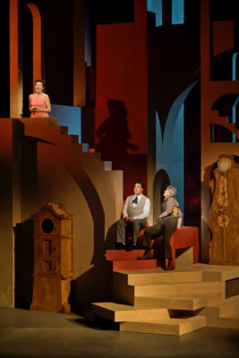 Dans un décor de tour-escalier stylisé (Sylvie Olivé), seules deux horloges s’encastrent à droite et à gauche. Le cliquetis des automates et mécanismes égare d’emblée le public qui ne les voit pas sur scène. Le ton est donné.