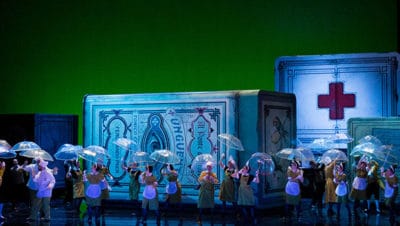 Quant à la mise en scène de Leo Muscato, elle est efficace, car elle contourne le problème des nombreux changements de tableau en demandant à sa décoratrice, Federica Parolini, de confectionner de gigantesques boîtes métalliques d’où émergeront un sous-bois, un réfectoire, une bibliothèque de direction, une chambre de malade. Et les costumes modernes de Sylvia Aymonino se jouent ironiquement des pensionnaires en pyjama, du personnel soignant échappé de la Croix-Rouge, quand le directeur arbore gilet rouge et redingote grise.