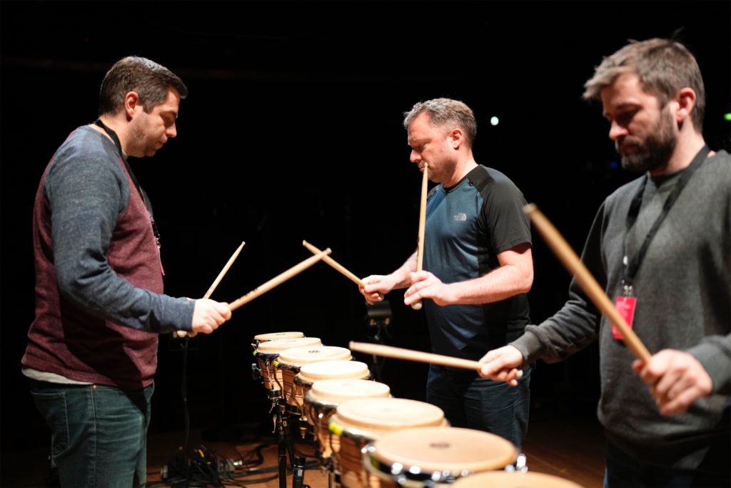 On revient bien sûr à lui pour le final du concert de clôture, avec Tehillim, qui marque le retour au judaïsme du compositeur et où il met en musique un texte articulé (des extraits de psaumes), pensant alors autrement la rythmique du morceau, ici assurée par les claquements de mains et les tambourins sans grelots, et suivant une mesure changeante, sans pattern rythmique patent : le texte importe peut-être plus par la musicalité de son chant (des voix féminines sans vibrato) que par son sens (16 ans plus tôt, dans It’s Gonna Rain, où l’on entend la voix d’un pentecôtiste à Union Square, les mots, intensifiés, semblent encore plus de la chair à sons, même s’ils signalent aussi, en arrière-plan, peu après la crise des missiles à Cuba, la peur d’une guerre nucléaire), car le compositeur cherche d’abord à émouvoir l’auditeur -qui n’est pas nécessairement en demande de comprendre ni la sémantique ni la mécanique de l’œuvre.