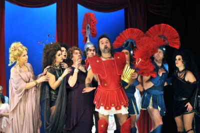 De toutes les opérettes d’Offenbach, La Belle Hélène (1864) est la plus théâtrale, en ce sens qu’elle contient le plus de dialogues. Le joyeux tandem Corinne et Gilles Benizio, connu à la scène sous son nom de clowns “Shirley et Dino”, a eu recours à la version tout à fait originale, rétablissant donc l’intégralité des “Jeux d’esprit” au premier acte (charade, calembour et bouts rimés) et du Jeu de l’Oie au second. Pour cela, il a été fait appel à une batterie de comédiens étincelants, acteurs avant tout mais chantant agréablement, renouant ainsi avec la tradition des années 1950 et des vedettes telles Duvaleix, Lucien Baroux ou Bourvil. Ainsi, le rôle de Calchas était-il joué/chanté par Bernard Alane et celui d’Ajax I par Manuel Durand. Quant à l’inénarrable Denis D’Arcangelo, il se tailla un franc succès en roi Ménélas, reprenant également le personnage de la suivante Bacchis. Côté chanteurs, l’équipe masculine était dominée par un très sonore Agamemnon (François Harismendy), l’amusant Oreste du ténor Alexander Swan, impayable chef de bande punk, l’Ajax II d’Ivan Geissler, le… bouillant Achille de Sébastien Romignon Ercolini, et surtout le très lyrique Florian Laconi en Pâris. Celui-ci a souligné la beauté de l’écriture vocale d’Offenbach, en particulier dans le si joli duo du rêve avec Hélène. La plus belle femme du monde était incarnée par Alexise Yerna, pilier de l’Opéra Royal de Wallonie, toujours aussi belle et entraînante, âme de cette production et largement ovationnée au salut final. Comment résister à ces tubes que sont la marche des rois et ses couplets immortels (“Je suis l’époux de la reine, -poux de la reine…”), l’air de Pâris “Au Mont Ida trois déesses”, l’ensemble “L’homme à la pomme”, la grande scène d’Hélène où Vénus fait “cascader la vertu”, le trio patriotique dans lequel Offenbach cite allégrement Rossini et Grétry, l’arrivée du Grand Augure (“Je suis gai, soyez gais, il le faut, je le veux”) ou le final exubérant “Pars pour Cythère” ? Décors et costumes brillamment colorés d’Isabelle Mathieu (ah, la tunique jaune de Ménélas !, la pizzeria balnéaire du dernier acte !), lumières finement ciselées (Jacques Rouveyrollis), tout concourait à une véritable fête visuelle. D’autant plus que le versant purement musical était parfaitement assuré par les choeurs (Marcel Seminara) et un orchestre chauffés à blanc, dirigés par le jeune Cyril Englebert. Citons enfin les plaisants intermède lors des changements de décors, lesquels flirtaient allègrement avec le jazz ou la musique de variétés (“Mais non mais non” d’Henri Salvador). Fête pour les yeux et les oreilles donc : le spectacle idéal de fin d’année, tel que l’Opéra Royal de Wallonie n’oublie jamais de proposer à son public fidèle et joyeux.