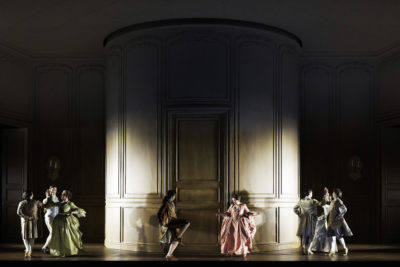 Le retour à un certain classicisme à une époque où de nombreuses productions d’opéras relèvent de l’imposture a certainement beaucoup contribué au succès de cette production mise en scène par Jetske Mijnssen. Si la scénographie de Julia Katharina Berndt transposant l’action à la fin du XVIIIe siècle use et abuse quelque peu de la « tournette » (plateforme tournante), elle dégage une impression de simplicité avec ses boiseries lisses à peine décorées par quelques bougeoirs que des serviteurs en livrée noire s’appliquent à allumer ou à éteindre selon les tableaux, contribuant à situer l’action de cet étrange opéra mythologique à la fin de l’Ancien Régime dans une atmosphère très codifiée et décadente quasi crépusculaire.