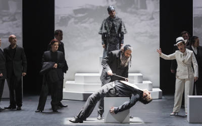 L’Opéra-Théâtre de Saint-Etienne ouvre sa Biennale Massenet avec l’un des élèves du maître, Reynaldo Hahn, et son unique ouvrage dramatique, ‘Le Marchand de Venise’. Créée à l’Opéra de Paris, le 29 mars 1935, avec André Pernet, Fanny Heldy, Paul Cabanel et Martial Singher, l’œuvre se base sur la ‘comédie’ satirique de Shakespeare.Et le metteur en scène Arnaud Bernard (qui a conçu aussi les décors) ainsi que la costumière Carla Ricotti en relèvent l’ambiguïté : propos antisémite ou trame qui met en exergue l’antisémitisme ? Mais pourquoi faut-il, une fois de plus, dériver vers la shoah de notre époque avec kippa sur costume noir et écrans amovibles où défilent, sans relâche, clichés en noir et blanc des atrocités de la barbarie nazie ? En dépit de ce fatras vite lassant, la musique y trouve son compte grâce à la direction de Franck Villard qui, à la tête des Chœur Lyrique et Orchestre Symphonique Saint-Etienne Loire, est en mesure de susciter un intérêt constant pour une écriture qui a la volonté de ‘faire grand’ tout en cultivant l’élégance mélodique d’où découle le charme suranné de ‘Ciboulette’. Sur scène, le baryton-basse Pierre-Yves Pruvot à la stature d’un Shylock dévoré par le fanatisme vindicatif face à son adversaire, le marchand Antonio campé par Frédéric Goncalvès, baryton au grain sombre. Par la rondeur soyeuse de ses aigus, Gabrielle Philiponet dessine une Portia radieuse, courtisée par le fringant Bassanio du jeune ténor Guillaume Andrieux. Les deux couples constitués par Isabelle Druet (Nérissa) – François Rougier (Gratiano) et Magali Arnault-Stanczak (Jessica) – Lorenzo (Philippe Talbot) complètent admirablement la distribution d’un opéra dont on souhaite régulièrement le retour à l’affiche.