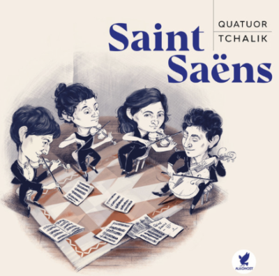 Le Quatuor Tchalik, que nous avons salué chaleureusement lors de la sortie, pour le même label, de pages enthousiastes de musique de chambre de Reynaldo Hahn (notre article du 24 décembre 2020), a donné son premier concert en 2013. Il est constitué de membres d’une même famille franco-russe : Gabriel et Louise au violon, Sarah à l’alto et Marc au violoncelle, dont la discographie, variée, comprend aussi les noms de Tishchenko, Respighi, Ravel, Escaich ou César Franck. On découvrira dans la notice de facétieuses caricatures des quatre interprètes, signées par Anna Komaromi. Elles s’ajoutent, comme des clins d’œil en miroir, à quelques dessins satiriques sur le compositeur, que l’on trouvait déjà dans le délicieux volume Croquer Saint-Saëns de Stéphane Leteuré (Actes Sud/Palazzetto Bru Zane, 2021).