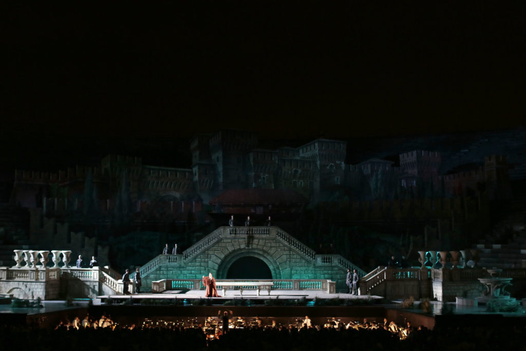 A côté de ce Nabucco avant-gardiste doublé par l’Aida de 2023 tout aussi déroutante, conçues toutes les deux par Stefano Poda, le Festival de cette année conserve un caractère traditionnel avec la production Zeffirelli de 1995 pour Carmen, celle imaginée en 2011 par Hugo De Ana pour La Traviata, et un Rigoletto de 2003 mis en scène par Ivo Guerra qui s’est basé sur la conception scénographique qu’Ettore Fagiuoli avait élaborée pour le premier Rigoletto de 1928 aux Arènes. Recourant au procédé de la toile peinte émanant d’une longue tradition italienne, le décorateur Raffaele Del Savio reproduit une impressionnante série de tours et forteresses en arrière-plan ainsi que les intérieurs et extérieurs de Mantoue, librement recréés pour évoquer le Palais Ducal ou le Palazzo Te. Les éléments en dur suggèrent les terrasses attenantes à ces demeures, la maison de Rigoletto et le bouge à ciel ouvert où ‘officient’ Sparafucile et sa sœur Maddalena. Les abords du Mincio baignent dans un crépuscule nébuleux d’où émergera un bien inutile fatras d’ondins couronnés et de nymphes grotesquement attifées. Sous les lumières suggestives de Claudio Schmid, les somptueux costumes dus à Carla Galleri parent la Cour ducale d’un faste dont la régie d’Ivo Guerra s’ingénie à révéler la corruption et le libertinage licencieux.