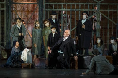 Pour la production de Nabucco, la Fondazione Arena collabore avec le Musée National du Judaïsme Italien et de la Shoah de Ferrare fournissant les images projetées en arrière-plan. Une fois de plus, l’on retombe dans la transposition éculée à la Seconde Guerre mondiale où les prisonniers juifs s’entassent avec leurs valises sous les miradors, escaliers et passerelles d’acier permettant au pouvoir nazi d’exercer son hégémonie. Au troisième acte, inutile de dire que les jardins de Babylone se métamorphosent en stade olympique pour les Jeux de 1936 magnifiés par les statues d’Arno Breker.