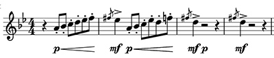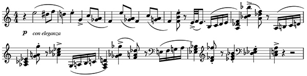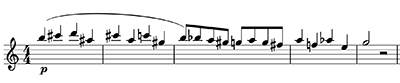 Cette phrase descendante commentée sur de rapides arpèges montantes du piano (p, dolce, un poco scherzando) se prolonge sur une phrase montante à l'orchestre commentée par des rapides arpèges descendantes et glissandi au piano.