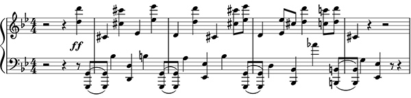 ceci est le schéma que l'on entend à travers les arpèges nerveux du piano et les pizzicati des cordes.