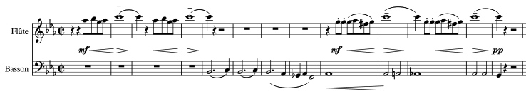 A la mesure 208 (env. 6'15''), la flûte et le hautbois s'emparent du Thème 1 (1) en diminution tandis que la clarinette, le cor et les altos reprennent des éléments du Thème 2.
