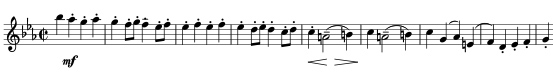 "Meno Mosso". Une première transition apparaît à la mesure 97 (env. 1'31'') basée sur des éléments du Thème 1 pour nous conduire au Thème 2 en Si bémol Majeur (là où on attendait Mi bémol Majeur mais déjà utilisé).