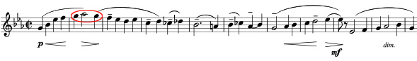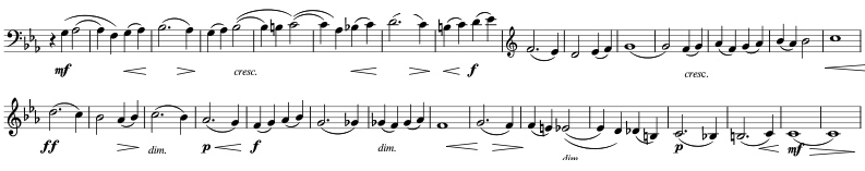 suivi un peu plus loin (Mes. 27 env. 1'02'') de sa deuxième partie énoncée par les violoncelles dans le ton de son relatif Majeur (Mi Majeur), une seconde partie plus lyrique, plus chantante mais tout aussi passionnée