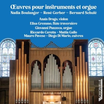 Œuvres pour instruments et orgue. Nadia Boulanger (1887-1979): Trois pièces pour orgue. Pièce sur des airs populaires flamands. René Gerber (1908-2006) : Épithalame pour flûte et orgue. Le Tombeau de N. Grigny pour violon, trompette et orgue. Fête pour deux trompettes, deux trombones et orgue. Pavane pour trois trompettes et orgue. Triptyque pour orgue. Bernard Schulé (1909-1996) : Métamorphoses sur un air ancien pour grand orgue Op. 51. Anaïs Drago, violon. Elisa Gremmo, flûte traversière. Riccardo Ceretta, Diego Di Mario, trombone. Mattia Gallo, Mauro Pavese, trompette. Giovanni Panzeca, orgue Tamburini de la Chiesa del Convento di Sant'Antonio de Casale Monferrato. 2024. Livret en français, italien, allemand, anglais. 70’49’’. Cascavelle VEL 1700