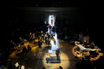 Il est indiqué « Placement libre » au parterre sur mon billet, ce vendredi soir. J’entre dans la grande salle de la Cité de la musique dans laquelle j’ai vécu depuis presque 30 ans les plus fortes expériences de musique de mon existence. …Pas de fauteuils… l’orchestre est au centre, on peut rester debout, ou s’asseoir par terre, un lit conjugal, une table, un grand tabouret, je réalise que je viens de faire moi-même irruption sur la scène, au milieu du décor, déjà la sensation d’être intrusif!