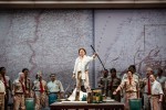 Un cadre scénique en bois clair faisant référence à l’Antiquité, deux teenagers sur planche à roulette dévalant les escaliers, un essayage de robe de mariée chez Saint-Laurent, robes de mousseline noire et complet-veston pour les courtisans, une table de cuisine avec couteau à pain servant à trucider deux innocents : ainsi peut-on résumer la production de Cristof Loy - Herbert Murauer où il ne se passe rien jusqu’au finale où l’on finit par s’agiter dans l’épouvante. Une question à ce ‘génie’ de la mise en scène qui a perpétré ici le massacre de La Donna del Lago et des Vêpres Siciliennes : avait-il oublié de commander les costumes ?