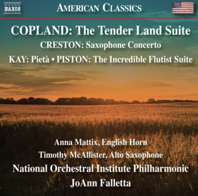 Aaron Copland (1900-1990) : The Tender Land Suite ; Paul Creston (1906-1985) : Saxophone Concerto, Op.26 ; Ulysses Kay (1917-1995) : Pietà ; Walter Piston (1894-1976) : The Incredible Flutist Suite. Anna Mattix, cor anglais ; Timothy McAllister, saxophone alto ; National Orchestra Institute Philharmonic, JoAnn Falletta. 2022. LIvret en anglais. Naxos. 8559911.