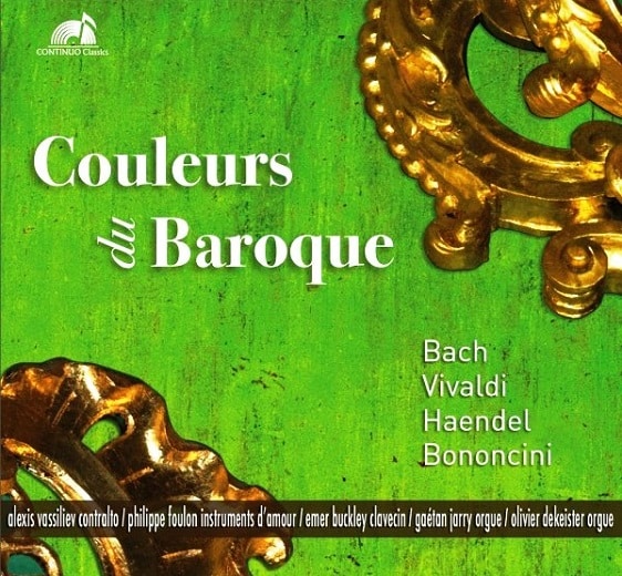 Couleurs du Baroque. Œuvres de George Frideric Handel (1685-1759), Giovanni Bononcini (1670-1747), Johann Sebastian Bach (1685-1750), Antonio Vivaldi (1678-1741), Nicolas Chédeville (1705-1782). Alexis Vassiliev, contralto. Philippe Foulon, viole, violoncelle d’amour. Olivier Dekeister, Gaétan Jarry, orgue. Emer Buckley, clavecin.Livret en français. Dates d’enregistrements non précisées ; paroles traduites en français. 50’30’’. Continuo CCC777 846