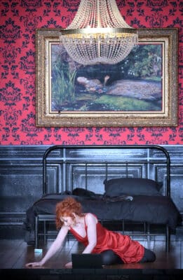 Au Théâtre des Champs-Élysées, le spectateur est comme dans la rue, face à un mur de briques noires, dans lequel, par un trou, on voit une chambre où tout est noir et rouge. Au mur, sur fond de papier peint rouge et au-dessus du lit noir, un tableau du peintre anglais John Everett Millais : Ophélie, représentée allongée. La femme s’en emparera, montrant au spectateur le parallèle entre leurs deux destins, où la mort par amour semble la seule issue possible. Le téléphone est un ordinateur portable posé au sol, que la femme ne regarde même pas (décidément, est-elle réellement en communication avec l’homme ?). La chambre tourne, brouillant tous nos repères. Ainsi, quand un angle se trouve au milieu, cela baisse le niveau de la chambre, ce qui permet à la femme de descendre directement dans la rue. Deux hommes font quelques apparitions, silencieux : l’amant du téléphone, et Joseph, le domestique de la femme. Ils seront, respectivement, Lui et L’autre dans Point d’orgue.