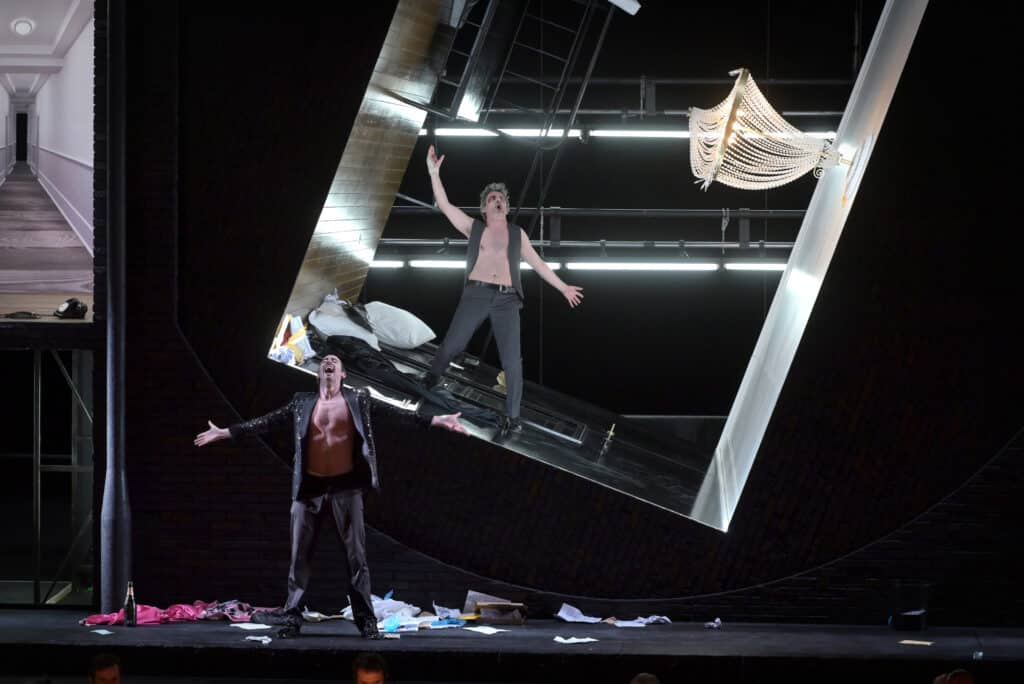 Ce personnage, c’est Lui (Jean-Sébastien Bou), époux d’Elle (Patricia Petibon), et qui entretient des rapports complexes avec l’Autre (Cyrille Dubois). Nous retrouvons donc sur scène, respectivement, l’homme, la femme et Joseph de La Voix humaine. Lui, compositeur en panne d’inspiration, possiblement troublé par sa propre sexualité (marié à une femme, mais dont l’on peut penser qu’il entretient avec l’Autre une relation à la fois homosexuelle et sadomasochiste), est profondément dépressif (à l’image de Poulenc lui-même). L’Autre (« une allégorie de la dépression elle-même » selon l’auteur) est un personnage brutal et sans limites. La chambre est dans un désordre désespéré, et quand elle se met à tourner, les partitions envahissent l’espace, à l’image des esprits tourmentés, d’alcool, de drogue et de violence, des deux hommes. Elle, qui n’intervient que tardivement et n’est plus la victime au bord du gouffre de La Voix humaine, vient sauver Lui : « Je serai là pour lui, je serai la lumière, et lentement, très lentement, il guérira. » Malheureusement, cette fois c’est Lui qui est au bord du gouffre, et qui s’y laissera entraîner par l’Autre.