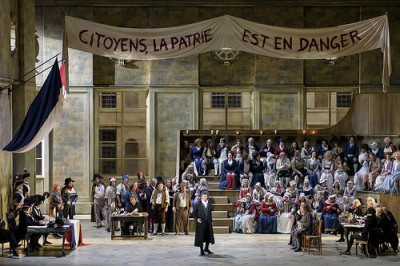 Le metteur en scène David McVicar a opté pour cette coproduction avec les opéras de Beijing et San Francisco, pour une lecture fidèle au livret et à la période historique. Les décors de Robert Jones évoquent la riche demeure des contes de Coigny, les rues de Paris de 1794, la salle du Tribunal révolutionnaire et la prison de Saint Lazare. Les costumes de Jenny Tiramani sont luxueux et d’époque. Dans ce cadre McVicar fait évoluer les personnages d’une façon réaliste et naturelle, ajoutant parfois des détails inutiles et discutables (l’enfant d’Idia Legray) mais tous sont emportés par l’élan de la musique . Sous la baguette de Antonio Pappano l’orchestre appliqué du Royal Opera peint l’élégance de l’aristocratie ,fait goûter l’esprit révolutionnaire et nous guide vers le climax final, cette célébration de l’amour et la mort chantée par des voix exaltées. Difficile d’y résister.