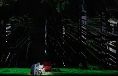 Lors de l’ultime accord en si majeur de la première journée du Ring, on assistait à une Brünnhilde abandonnée en haut d’un échafaudage alors que Wotan, après avoir détruit son super-ordinateur, s’en allait en répandant un gaz toxique qui se répandait petit à petit sur la Terre sur fond d’apocalypse digitale. L’on retrouve désormais une Nature profondément altérée par cette agent chimique, jusque dans sa cohérence gravitationnelle. Scéniquement, cela se traduit par des arbres à l’envers et/ou perpendiculaires, signés Rebecca Ringst, qui viennent s’ajouter aux structures métalliques déjà présentes dans la journée du Ring.