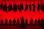 Sur la scène de l’Opéra Comique se succèdent douze tableaux qui demeurent constamment dans l’imaginaire du conte. Les costumes de Molly Irelan mêlent références réelles et fantastiques, époques anciennes et modernes, suggérant une forme d’intemporalité. Les vidéos de forêt conçues par Hana Kim possèdent une grande poésie : l’espace qui leur est réservé — une bande horizontale dont la hauteur dépasse à peine la taille humaine — renforce l’impression d’un arrière-plan omniprésent. Autour de cette projection, la scénographie d’Adam Rigg privilégie des effets spectaculaires à des moments clés : les loups suspendus apparaît juste avant la fin de la première partie, et ils le restent pendant une grande partie de l’œuvre ; ou encore l’apparition d’Anubis, qui balaie la forêt d’un rouge sanglant. Dans ces instants, les lumières de Yi Zhao se révèlent d’une redoutable efficacité. La mise en scène de James Darrah n’hésite pas non plus à accentuer la violence du récit, notamment lors de l’arrachement du cœur d’un loup puis de celui de Peter par sa mère. Les robes des personnages féminins prolongent quant à elles l’imaginaire du conte. Sous la dramaturgie d’Olaf A. Schmitt, l’ensemble compose un univers à la fois onirique et inquiétant, où l’angoisse du fils se transforme peu à peu en culpabilité maternelle.
