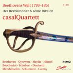 « Le monde de Beethoven 1799-1851. Le révolutionnaire et ses rivaux. » Ludwig van Beethoven (1770-1827) : Quatuor N° 1, Op. 18 N° 1 ; Quatuor N° 9, Op. 59 N° 1 ; Quatuor N° 16, Op. 135 – Adalbert Gyrowetz (1763-1850) : Quatuor Op. 47 N° 3 – Joseph Haydn (1732-1809) : Quatuor Op. 77 N° 1 – Luigi Boccherini (1743-1805) : Quatuor Op. 64 N° 1 – Peter Hänsel (1770-1831) : Quatuor Op. 20 N° 4 – Gaetano Donizetti (1797-1848) : Quatuor N° 17 – Franz Schubert (1797-1828) : Quatuor N° 14, D. 810, « La jeune fille et la mort » – Felix Mendelssohn Bartholdy (1809-1847) : Quatuor N° 2, Op. 13 – Robert Schumann (1810-1856) : Quatuor N° 3, Op. 41 N° 3 – Carl Czerny (1791-1857) : Quatuor N° 28. Quatuor Casal. 2017-2019. 73’08 + 75’15 + 80’20 + 58’19 + 24’50. Livret en anglais et en allemand. 5 CD Solo Musica. SM 283.