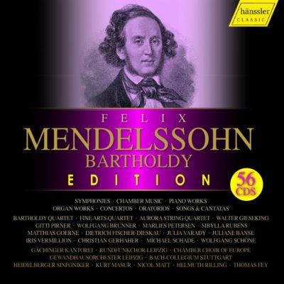 Edition Felix Mendelssohn (1809-1847). Musique symphonique, concertos, musique de chambre, œuvres pour piano seul, pièces pour orgue, oratorios, cantates et lieder. Divers interprètes. 2019. Pas de livret, mais plaquette reprenant le détail du contenu. Environ 60 heures. Un coffret Profil Hänssler de 56 CD HC19058.