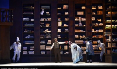 En ce début d’automne, le Teatro La Fenice reprend trois de ses productions, La Traviata selon Robert Carsen, une Tosca modernisée par Serena Sinigaglia et La Cambiale di Matrimonio de Rossini dont la basse bouffe Enzo Dara avait élaboré la mise en scène pour le Teatro Malibran en mars 2013 : dans un rythme soutenu, sa régie se contente de respecter la tradition de la simple farsa sans appuyer sur les ficelles du comique. Avec l’aide de l’Ecole de Scénographie des Beaux-Arts de Venise, le décor de Stefano Crivellari use de gigantesques étalages en parois et de coupons de tissus tombant des cintres, laissant apparaître une Giudecca stylisée en toile de fond ; et sous de plaisants éclairages conçus par Elisa Ottogalli, les costumes de Federica Miani prennent un cachet romantique que pimente l’apparition d’arlequins à la Tiepolo.